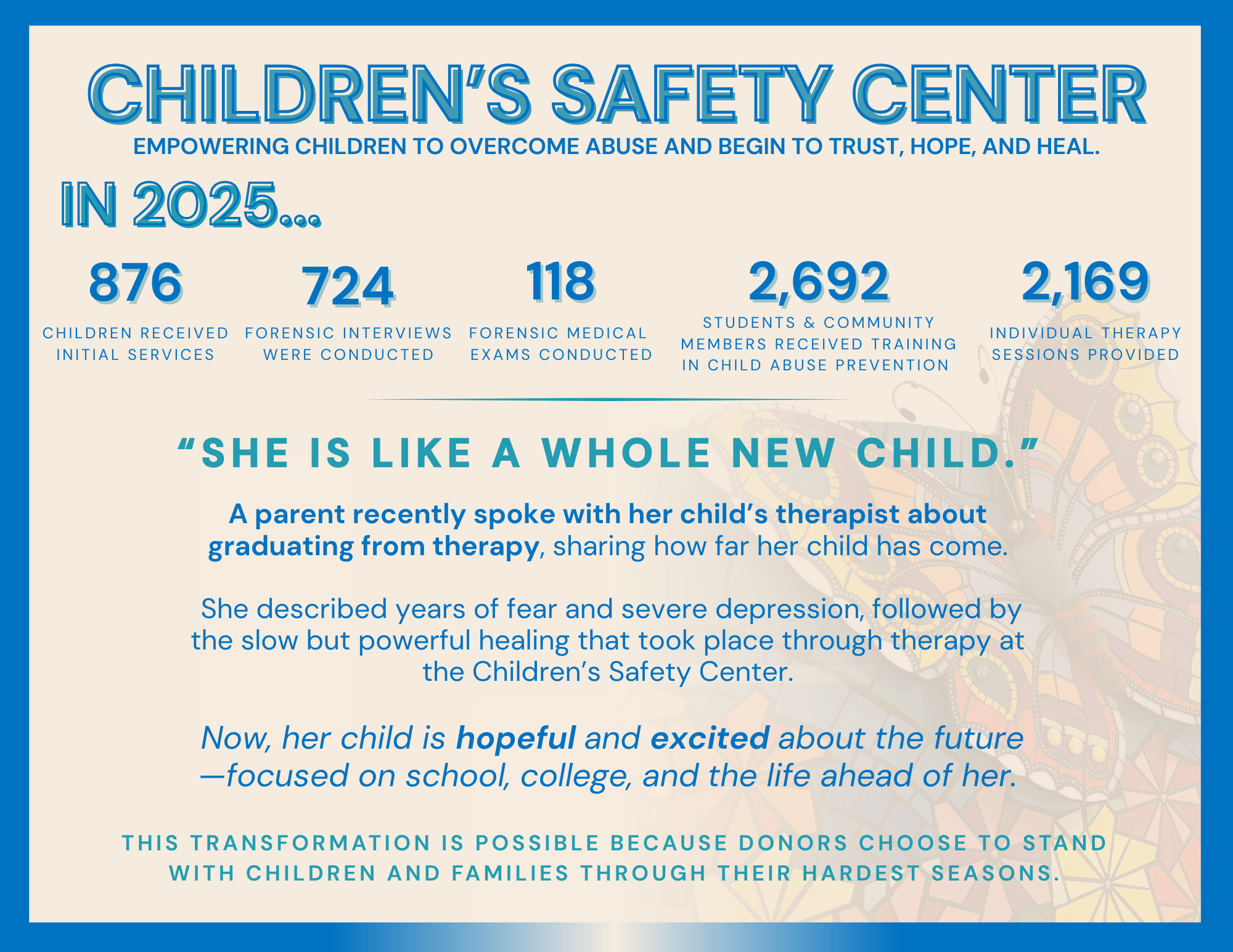 Children’s Safety Center of Washington County (CSC) is a nonprofit 501(c)(3) organization. Our impact reports show an overview of our programs for child abuse victims, how many children are receiving services, and how your donations are being used. Exemplifying the highest level of stewardship, we are a proud GuideStar Exchange Platinum Participant. We have a responsibility to our community and our donors and work hard to ensure long-term sustainability of the organization.